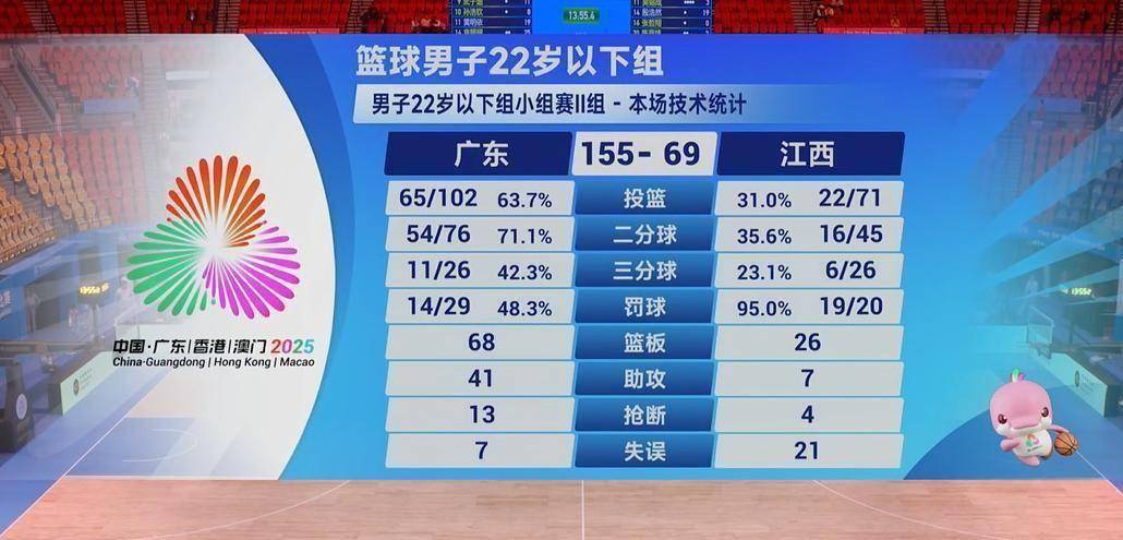 全场比赛的技术统计显示,广东队投篮命中率高达63.7%,抢下66个篮板球,送出41次助攻,而失误仅有7次。 这样的数据对比江西队的31个篮板和不到10次的助攻数,凸显了两队在天赋、训练和比赛经验上的巨大鸿沟。