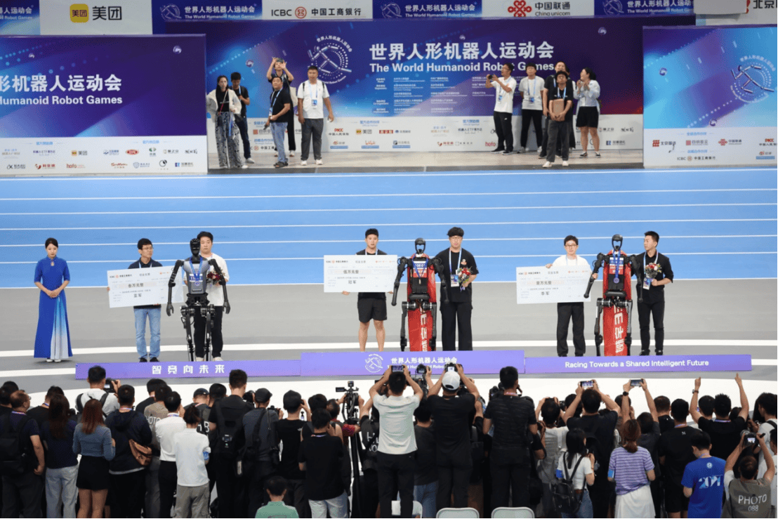 400米决赛是今天最后一个结束的项目,比赛过程非常激烈。最终,宇树科技旗下高羿科技机器人以1分28秒03夺冠,北京人形机器人创新中心有限公司的天卓、天骁这对“兄弟”分获银牌和铜牌。