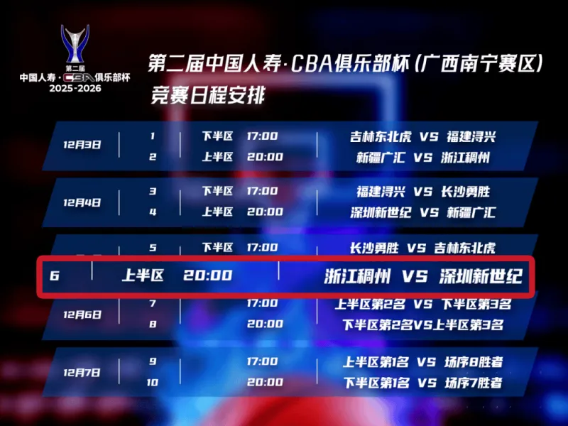 第二届中国人寿·CBA俱乐部杯(广西南宁赛区)焦点战重磅来袭!12月3日-7日,广西体育中心体育馆将燃起篮球激情,12月5日20:00,“外线闪电”浙江稠州与“锋线天团”深圳新世纪正面碰撞。一边是极速攻防的外线利刃,一边是天赋满格的锋线军团,首届赛事中,浙江稠州与深圳新世纪凭借各自的亮眼表现和强劲实力圈粉无数;第二届赛事,两支强队再度登场,这场备受期待的精彩对决,注定点燃邕城之夜,成为年度不容错过的篮球盛宴!