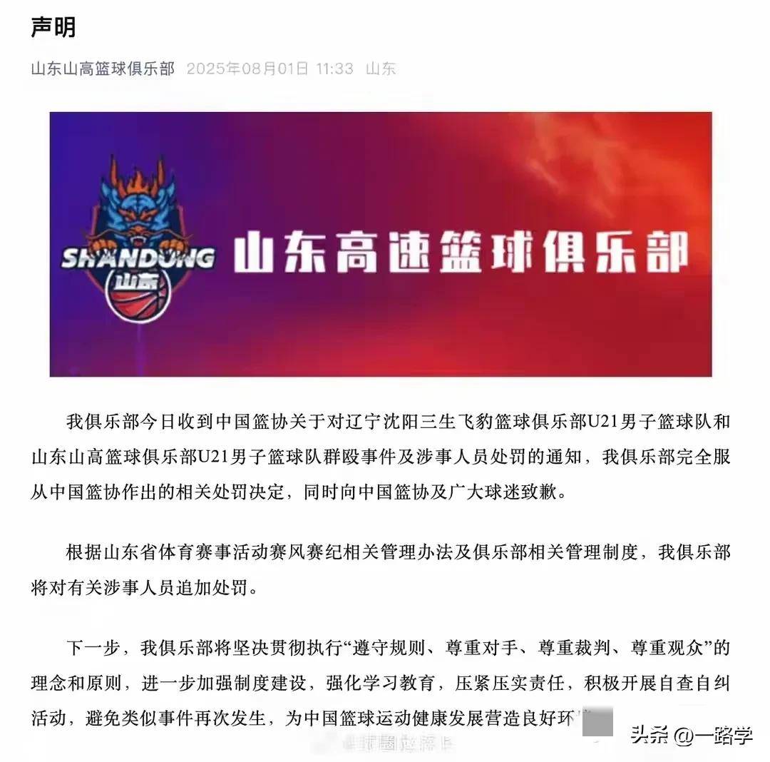 处罚结果公布后,山东队很快就有了回应。8月1日上午11点多,山东高速篮球俱乐部就发了声明,说完全服从篮协的处罚,还向篮协和球迷道歉,认为会对涉事人员追加处罚,以后会加强管理。
