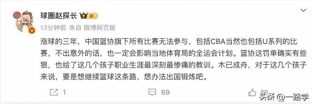 对这些年轻球员来说,这个处罚影响太大了。像辽宁队的黄秋实,本来下赛季有希望进入一队轮换,填补球队锋线的空缺;山东队的袁帅已经被一线队主教练邱彪看中,参加过热身赛,新赛季很有机会留在CBA。如今三年停赛下来,他们要么只能去国外联赛寻找机会,要么就得在非常关键的成长期错过实战锻炼。