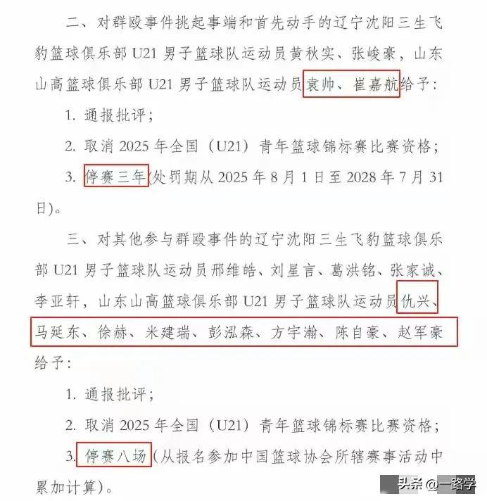 根据篮协的处罚通知,这次一共有20多名球员和教练受罚。其中非常严重的是4名球员,辽宁队的黄秋实、张峻豪和山东队的袁帅、崔嘉航,他们被直接停赛三年,从二零二五年8月1日一直到2028年7月31日。这意味着这几位年轻人在非常该涨球的黄金时期,没法参加任何中国篮协旗下的比赛,包括CBA和全运会,唯一的出路只能是出国寻找机会了。
