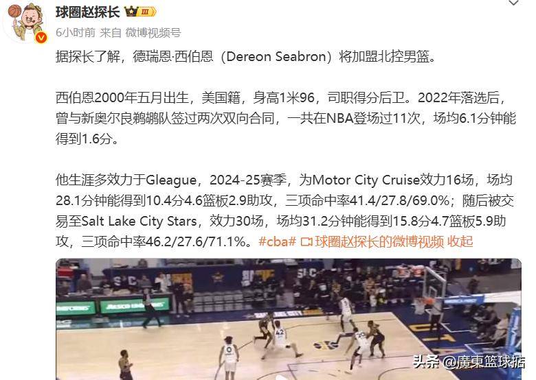 与此同时,国内媒体人“球圈赵探长”披露,另一支CBA劲旅北控队则传来喜讯,他们即将签约新外援德瑞恩·西伯恩,为球队注入新的活力。